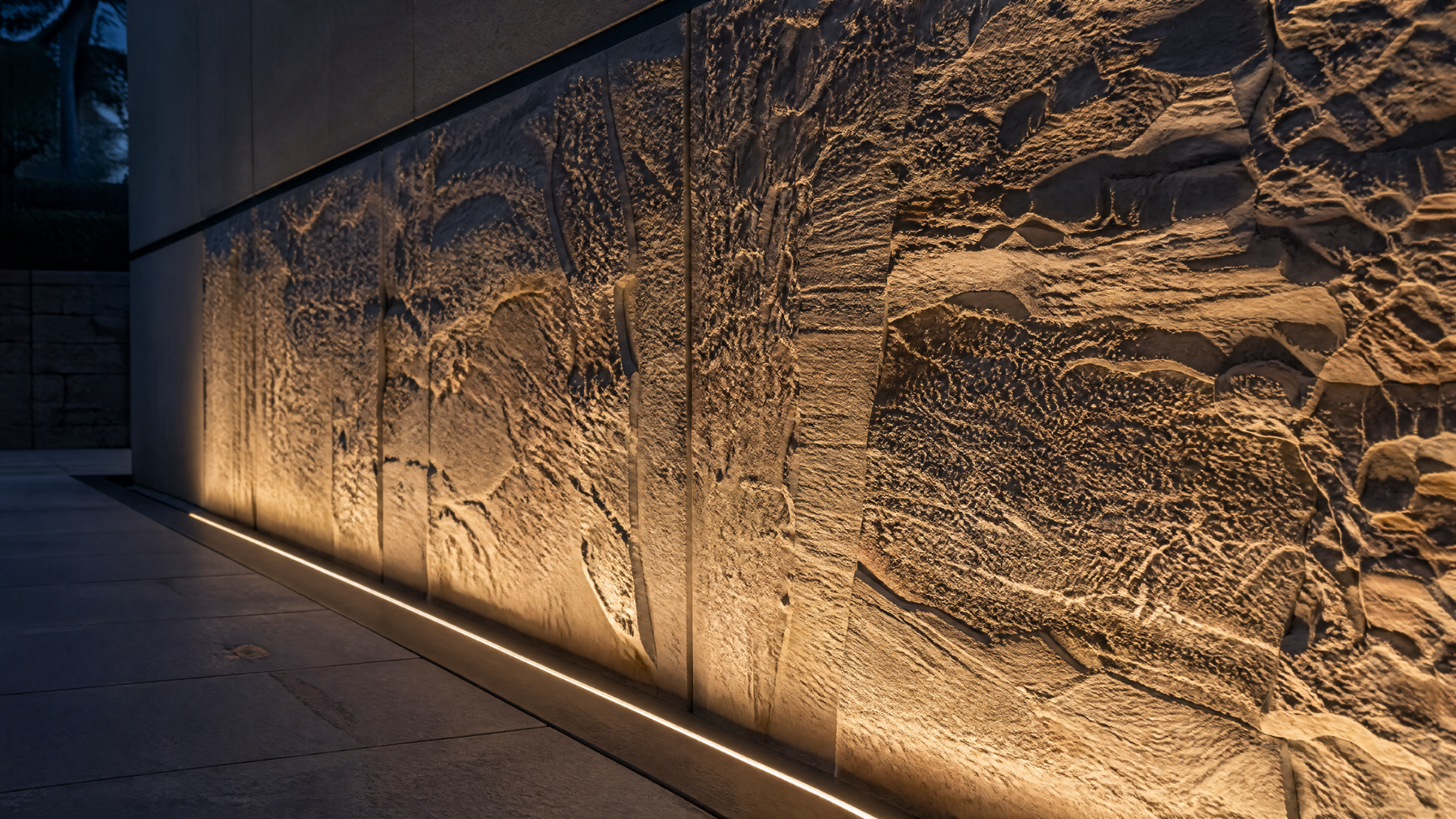 La primera capa opera a escala peatonal. Es la luz que un transeúnte ve cuando se aproxima al edificio, cuando lo toca con la mirada antes de entrar.